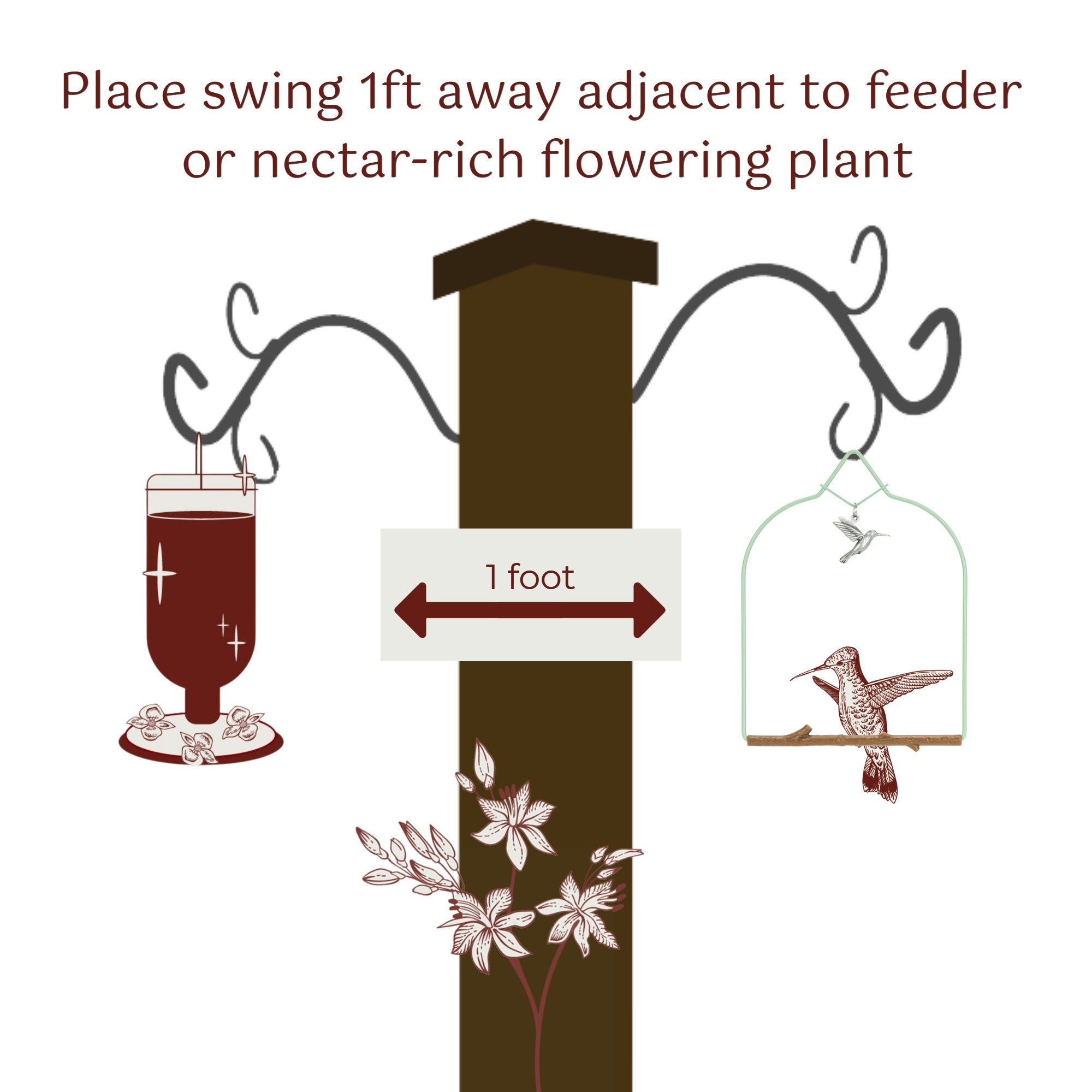 Just place swing within a foot of a food source and hummingbirds will use the swing as a territorial perching spot to keep close watch over their guarded food supply!